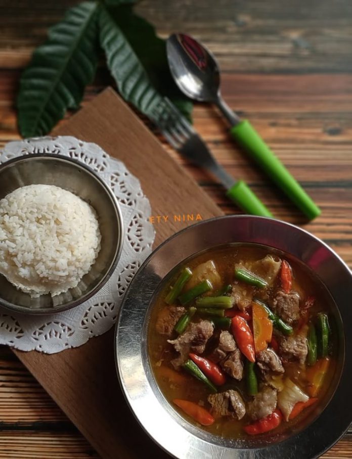 3. Masukkan tumisan bumbu kedalam kuah daging, bersama belimbing sayur, buncis dan wortel yang sudah diiris iris, kemudian air asam, gula dan garam.