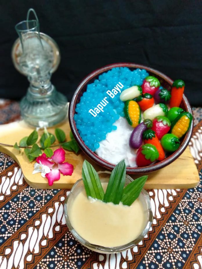 Biasanya biji salak berbentuk bulat, kali ini saya membentuknya menjadi buah-buahan mini, dipadu dengan bubur sum-sum dan biji mutiara dengan pewarnaan alami bunga telang dengan siraman kuah santan kinca