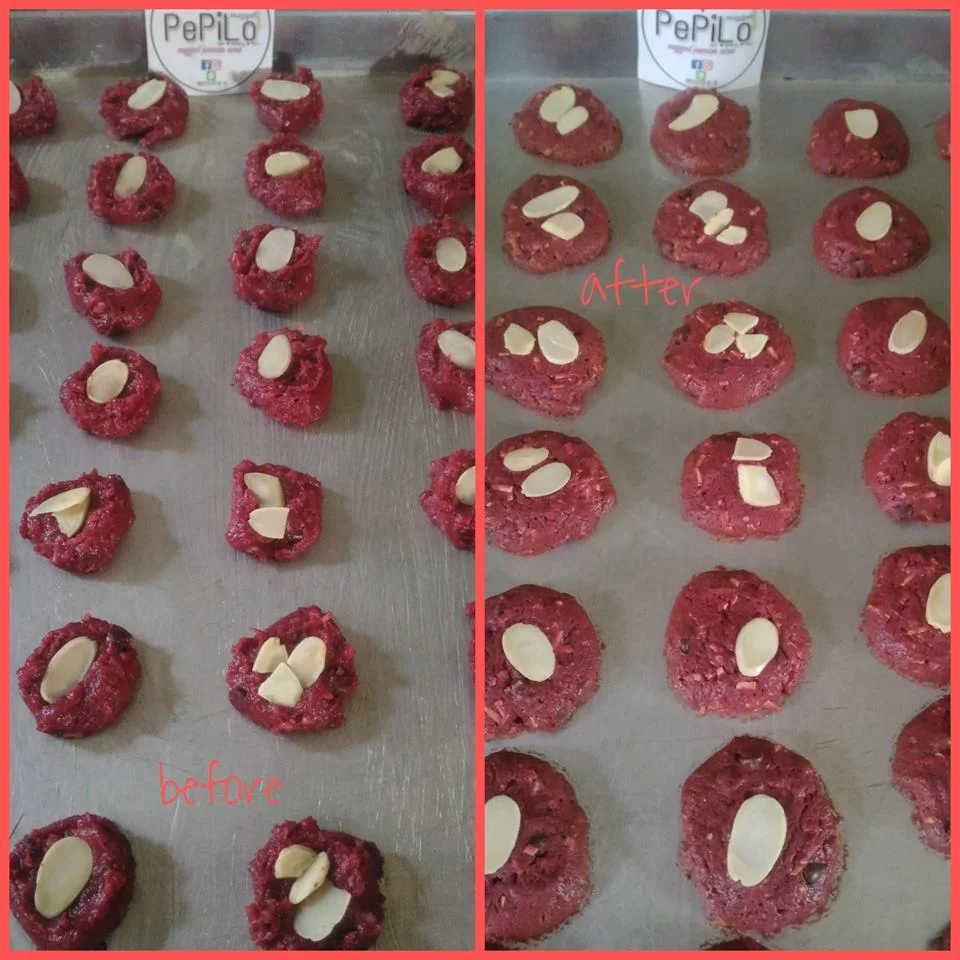 saya lagi coba bikin red velvet cookies nih bun.saya pake resep punya bunda tintin rayner..
