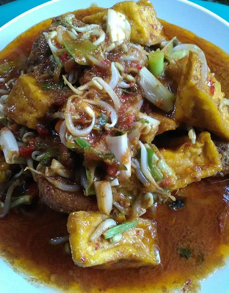 Cuma bawang putih dan cabe diulek sama kacang tanah goreng…lalu ditumis kasih air kasih garam.penyedap.gula dan kecap…tambahin asam jawa dikiiit aja..biar ada sensasi rasa..masukan tahu yang udah digoreng..aduk..terakhir masukan toge dan daun bawang
