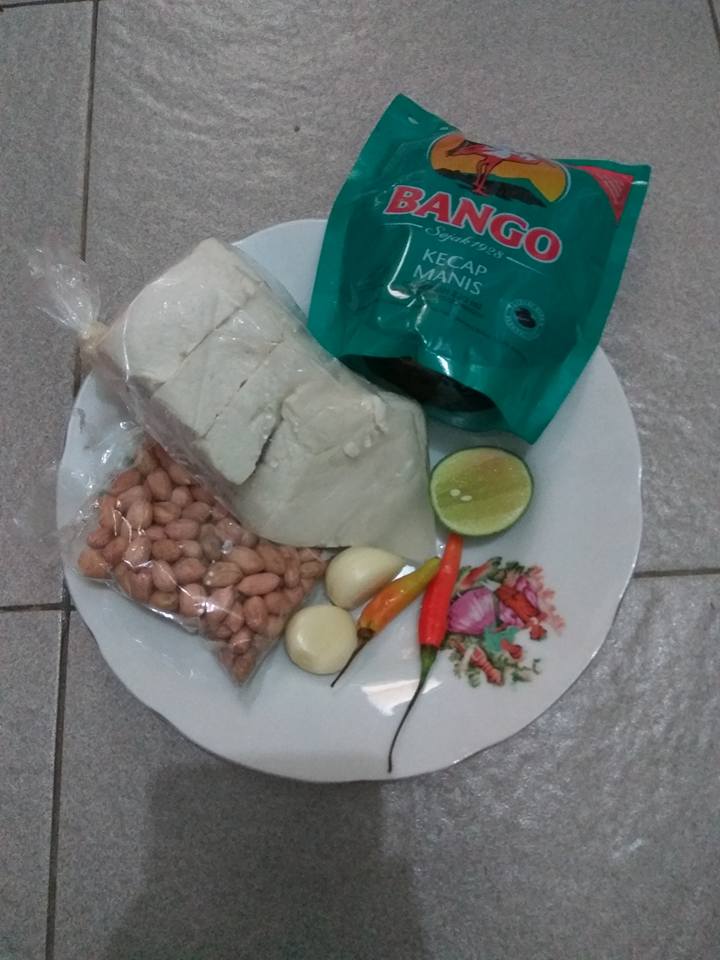 Susun bahan pelengkap di piring,siram sambal kacang..