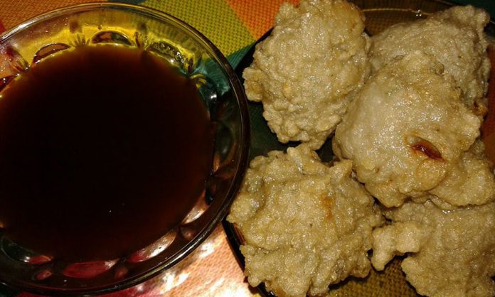 5. Cara menggorengnya yaitu celupkan tangan ke dalam tepung tapioka atau bisa juga dicelupkan ke dalam air. Lalu ambil sejemput sambil dipipihkan dan digoreng. Sajikan dengan cuko.